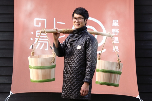 その日の外気温に応じて、トンボの湯の湯守が最適な温度の足湯を用意します。また、足湯に浸かってから少し時間がたち、湯温が下がり始める頃合いをみて、湯守が天秤棒を担いで熱い温泉を運び、足し湯を行います。そうすることで、足湯の温度が40度以上に保たれ、心地よい温かさの足湯をゆっくりと楽しんでいただけるように趣向を凝らしました。さらに、地酒についても、木製の器の中にお湯を入れ、燗酒が冷めないよう工夫を施しています。