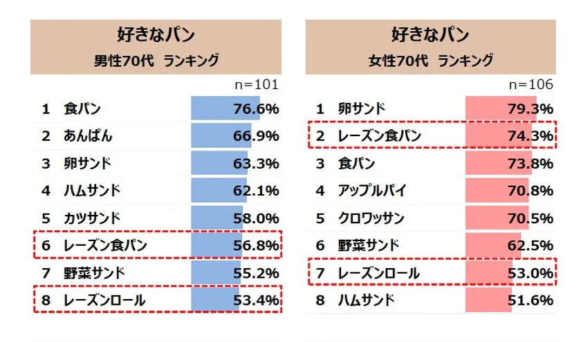 「好きなパン」を男女別でみると、男性は「カツサンド」「ホットドッグ」などボリュームのあるパンが上位に、女性は「アップルパイ」「バゲット・フランスパン」など食感を楽しめるパンが上位に上がってきた。年代別でみると、男女ともに70代は「レーズン食パン」「レーズンロール」といずれも「レーズン」が含まれたパンが10位以内に上がっている。