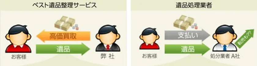 ベスト遺品整理サービス(画像左)と一般的な遺品処理業者(画像右)のサービスの違い
