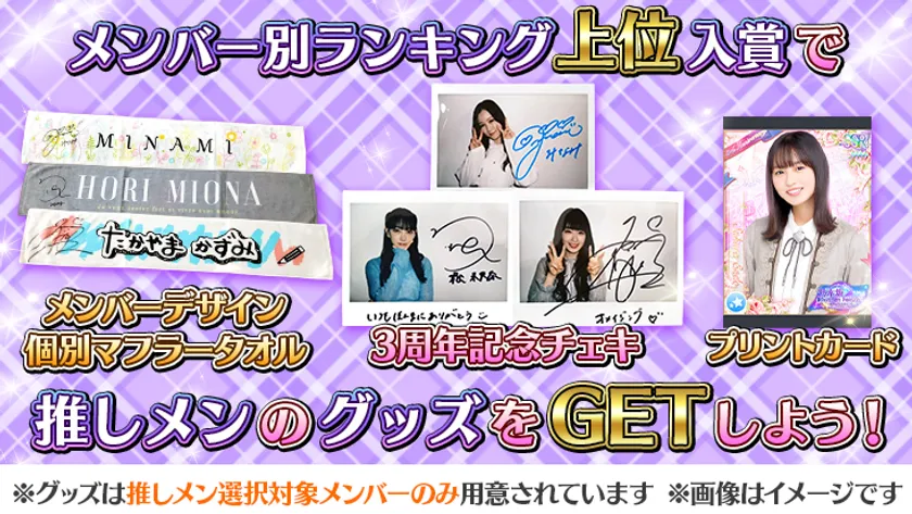 推しメン別のランキングで入賞して、直筆サイン入りの激レアな「チェキ」や「マフラータオル」をGETしましょう!