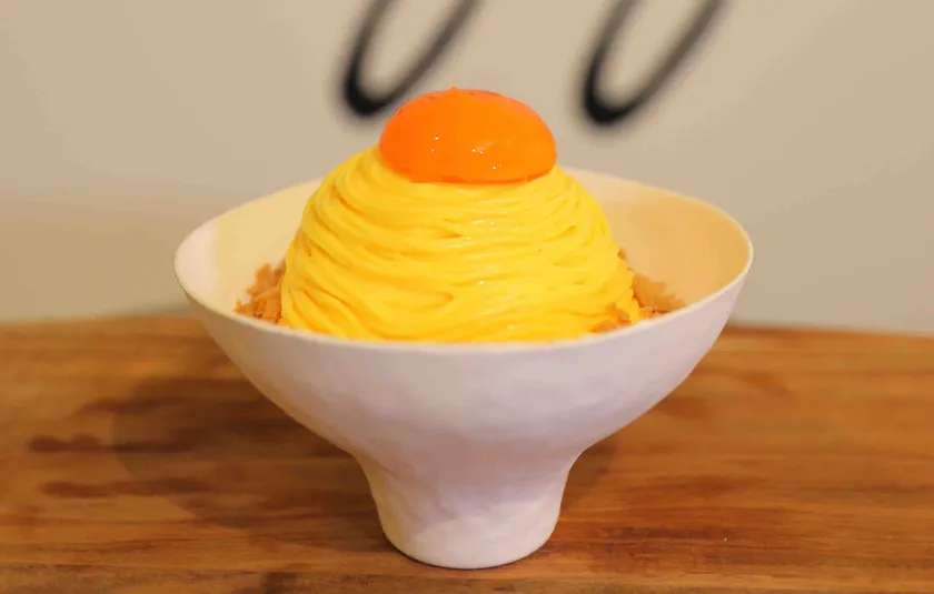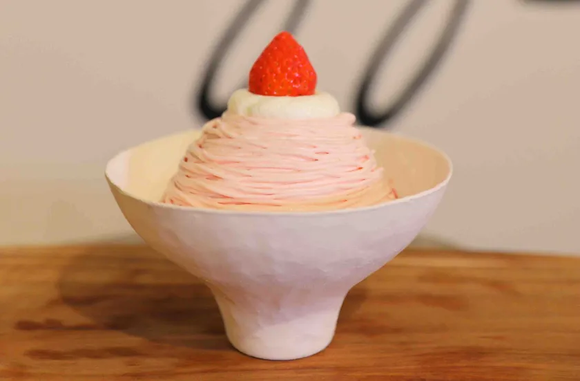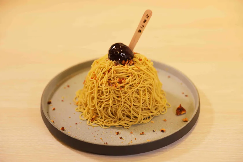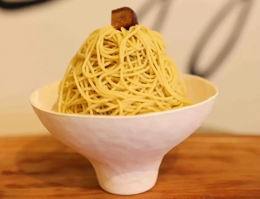 茨城県産の和栗ペーストを使用し、細く絞った和栗クリームはとても口溶けがよく、栗本来の風味が楽しめます。クリームの中には和栗を引き立てる、ほうじ茶ミルクプリンとコーヒーシロップを浸み込ませたパンケーキが入っています。さらに香ばしいカリカリ食感のくるみのキャラメリゼも相性抜群です。