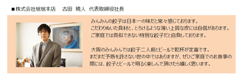 これまで当社では、産地応援企画としてコロナ禍により影響を受けた生産者や企業の支援を目的に、各地の銘産品を販売してまいりました。今回は餃子の皮・具材にこだわって提供し続けている珉珉の生ぎょうざをご家庭で手軽にお楽しみいただけるよう、冷凍商品にてご提供いたします。