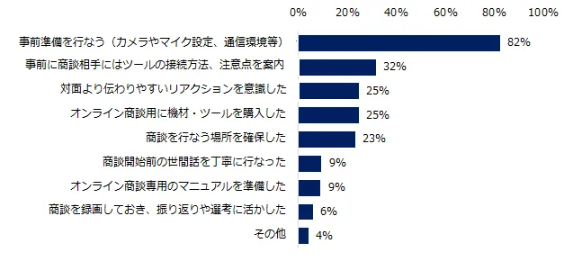 オンライン商談導入企業に「オンライン商談を実施する際に、気をつけたことや工夫点を教えてください」と伺うと、最も多かった回答は「事前準備を行なう(カメラやマイク設定、通信環境等)」(82%)でした。