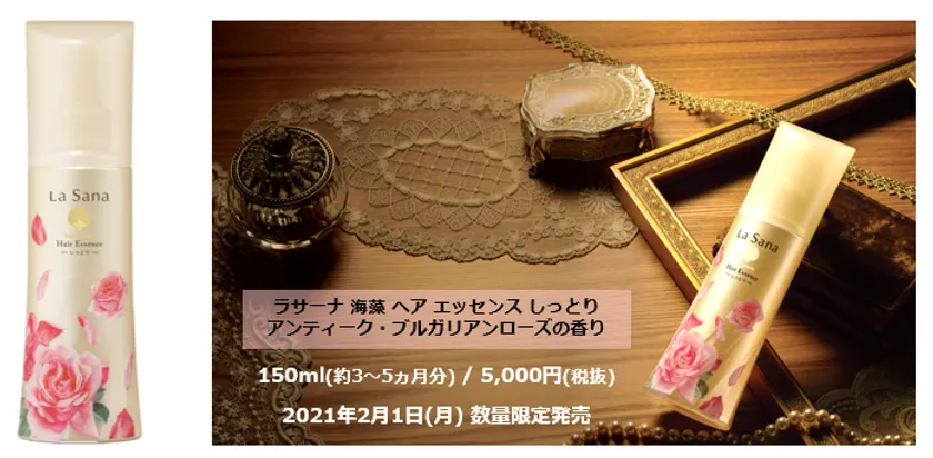 洗い流さないトリートメント全国売上12年連続NO.1(※2)の海藻コスメブランド「ラサーナ」を展開する株式会社ヤマサキ(本社:広島市、代表取締役:山崎 宏忠)は、人気の洗い流さないトリートメント「ラサーナ 海藻 ヘア エッセンス」から2017年に発売してから毎年大好評いただき、早々に完売した実績もある限定の香り『ラサーナ 海藻 ヘア エッセンス しっとり アンティーク・ブルガリアンローズの香り』(150ml/5,000円税抜)を、2021年2月1日(月)より通信販売・インターネットにて、数量限定でリピート発売いたします。
