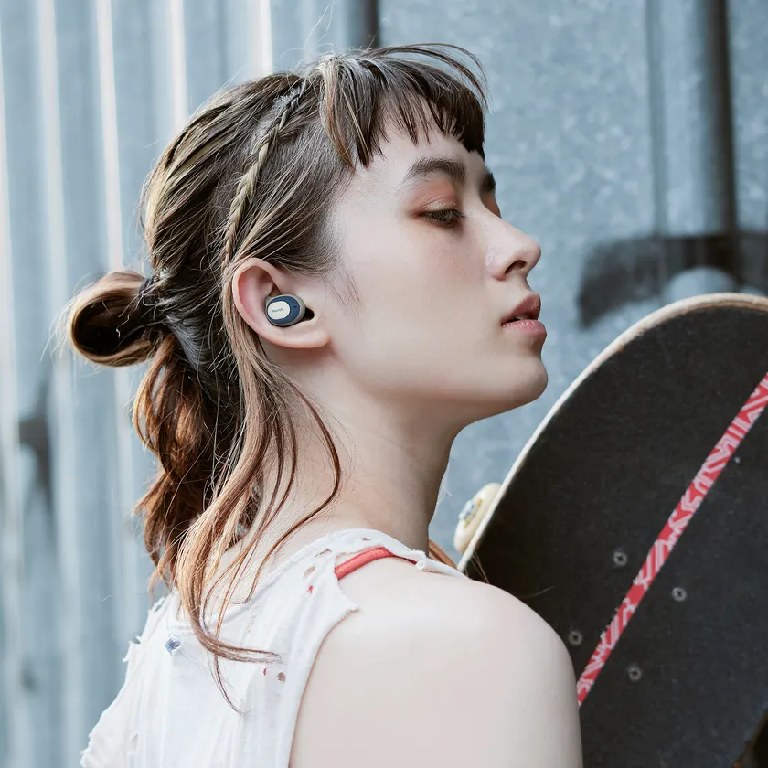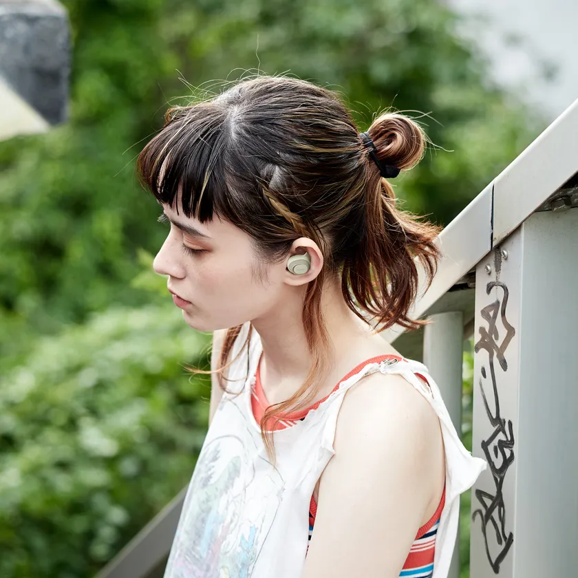 音楽の再生停止にかかわらずイヤホンを着けたまま周囲の音が聞ける外音取り込み機能がご使用いただけます。音楽再生中は再生音への影響を抑えるミュージックモードに、音楽の停止中は会話がし易いトークモードに外音取り込みを自動的に切り替え。さらに付属の低遮音イヤピース「Track Ear+」を組み合わせることで、風の強い場所や運動時、外音取り込み機能を使えない通話時やテレワークのビデオ会議時でも自分の声や周囲の音が聞こえるばかりでなく、イヤホンを耳につけたままの状態でも空気が通るので蒸れにくく長時間使用しても快適です。