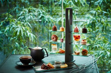 「現代の茶会」をコンセプトに、本格的なお茶を様々なスタイルで楽しんでいただける「TEA&BAR」。ザ・サウザンド キョウトがお贈りする冬のアフタヌーンティーは、冬に恋しくなるチョコレートを贅沢にアレンジしたラインナップ。「Choco・Ta・noon (チョコタヌーン)」というネーミングには、「Ta=Thank you」の意を含ませ、大好きなチョコレートに「ありがとう (大好きよ)」という気持ちとともに、午後のひとときを至福の心地でお過ごしいただきたいというパティシエチームの想いを込めています。スタイリッシュなスタンドの上段に並ぶのは、上質なチョコレート4種にそれぞれフルーツを掛け合わせた、パティシエこだわりのベイクドチョコレートチーズケーキです。ミルクチョコレート、ゴールドチョコレート、ルビーチョコレート、ノワールチョコレート、これら4種の風味豊かなチョコレートの食べ比べを楽しんでいただけます。