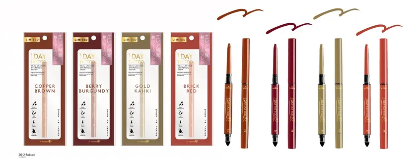 「K-パレット リアルラスティングアイペンシル 24h WP」から、メタリックな艶感の限定4色「コッパーブラウン、ベリーバーガンディー、ゴールドカーキ、ブリックレッド」が登場です。締め色だけど軽さも感じる色合いとメタリックな艶感で、くっきりと濃くひいても抜け感をキープ。ぼかしてアイシャドウのように使ったり、インラインや下まぶたにと様々な使い方が楽しめます。
