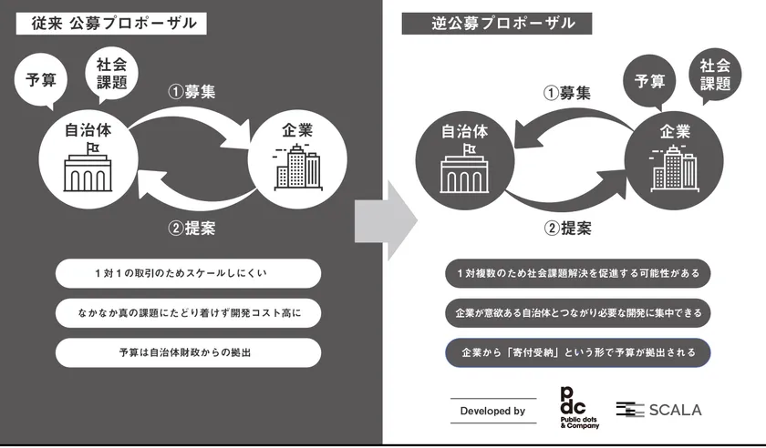 従来の自治体から民間への公募受発注のベクトルを逆にし、社会課題を解決したい民間企業が、同じく住民の課題を解決したい自治体と出会うことで、諸課題の解決を促進する狙いです。