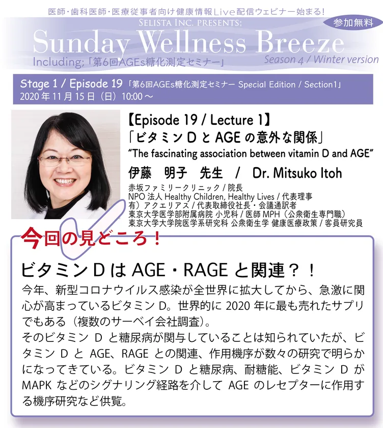 今回のLecture1では、赤坂ファミリークリニック院長、東京大学医学部附属病院小児科の伊藤 明子(いとうみつこ)先生による「ビタミンDとAGEの意外な関係 / The fascinating association between vitamin D and AGE」です。