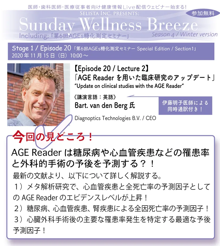 そしてLecture2では、今世界中で注目を集めている老化物質『AGEs:Advanced Glycation End-products / 終末糖化産物』を非侵襲的に測定できる世界で唯一の医療承認機器「AGE Reader」の開発元Diagnoptics Technologies B.V.(オランダ) / CEOのBart. van den Berg氏より「AGE Readerを用いた臨床研究のアップデート / Update on clinical studies with the AGE Reader」について講演して頂きます。講演言語は英語ですが、伊藤 明子医師による同時通訳でお届けします。