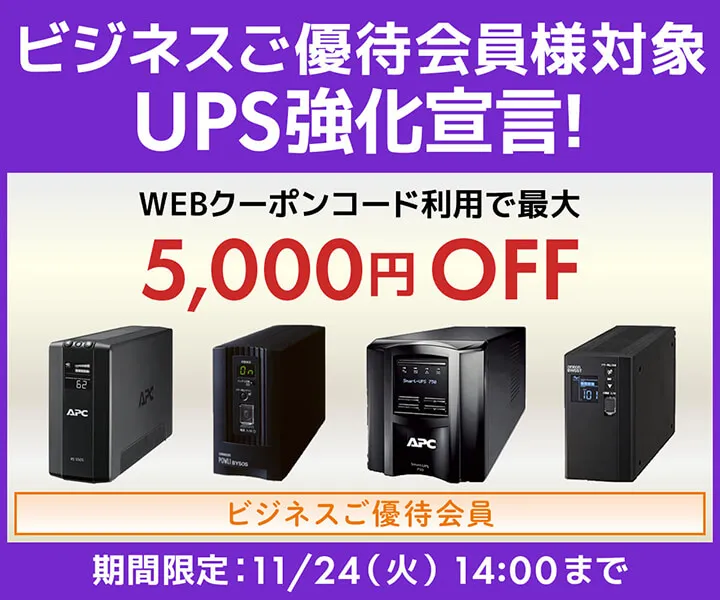 UPS強化宣言を記念して、ビジネスご優待会員様を対象に2020年11月24日(火)14:00までの期間限定で「UPS強化宣言セール」を開催!ビジネスご優待会員限定で、対象商品にてWEBクーポンコードがご利用いただけます。スタッフ厳選のUPS商品が今だけお買い得!ぜひこの機会に導入をご検討下さい。