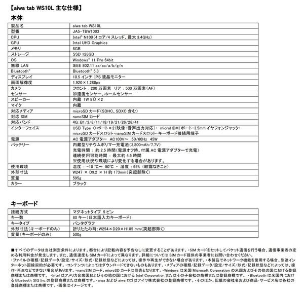 テクミラホールディングスの子会社であるアイワマーケティングジャパン株式会社(本社:東京都千代田区、代表取締役社長:藤岡 淳一、以下 アイワマーケティングジャパン)はaiwaブランドの新製品として、ビジネスユース向けの性能とインターフェイスを兼ね備えた10.5インチ 2in1 Windows® SIMフリータブレット【aiwa tab WS10L】(以下 本製品)を、「ダイワボウ情報システム」、「TD SYNNEX」にて法人限定モデルとして販売開始いたしました。