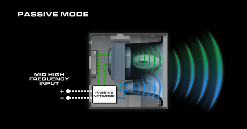 XY-3B同様に、斜めに取り付けられた2基の12インチの低域ネオジムコーンドライバーを駆動することで、バッフル板に囲まれた空間に負荷をかけ、タイトでパンチのあるローミッドを提供します。
