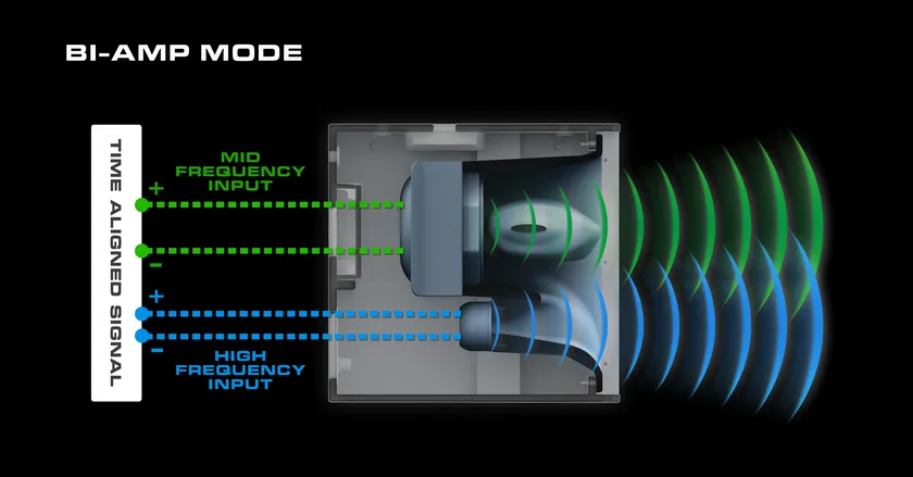 追加のパーツを用いることなく、スピーカーに内蔵されたケーブルを差し替えるだけで、8インチの中域ネオジムコーンドライバーと1インチの高域ネオジムコンプレッションドライバーを個別に駆動することができます。