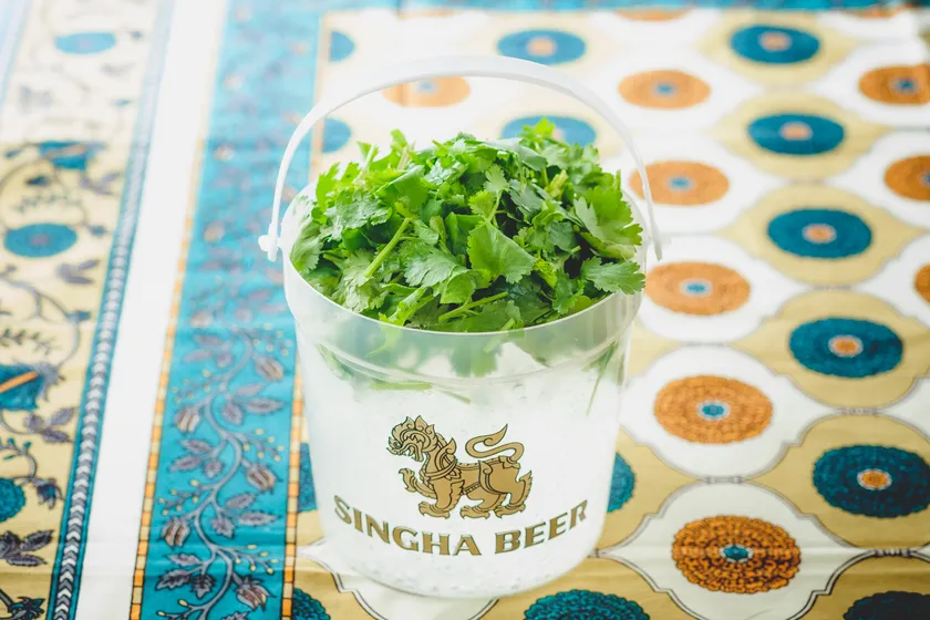 「モーオブ」という専用の手鍋に、パクチー・春雨・海老などを入れて強火で蒸し焼きにしたタイ人に大人気のメニューです。