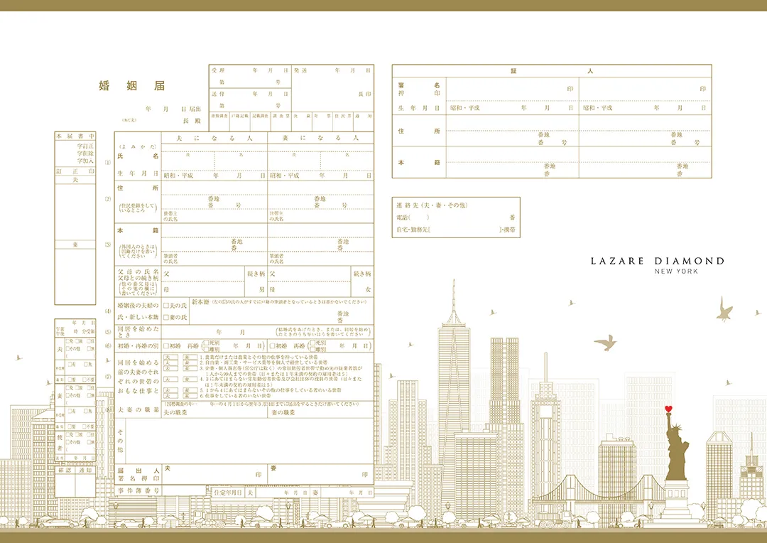 期間中、エンゲージリングまたは、マリッジリングをご成約いただいたおふたりに、「ラザール ダイヤモンド オリジナル婚姻届」をプレゼントいたします。ニューヨークの洗練が薫るエレガントな婚姻届を眺めるたび、プロポーズの感動がよみがえります。※なくなり次第終了とさせていただきます。