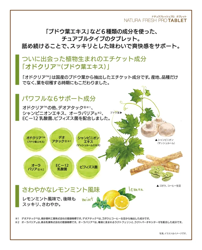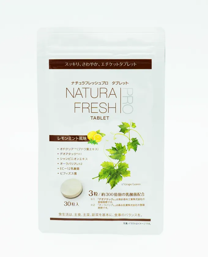 「ナチュラフレッシュプロ タブレット」は、「ブドウ葉エキス」など6種類の成分を使ったチュアブルタイプのタブレット。舐め続けることで、スッキリとした味わいで爽快感をサポートします。