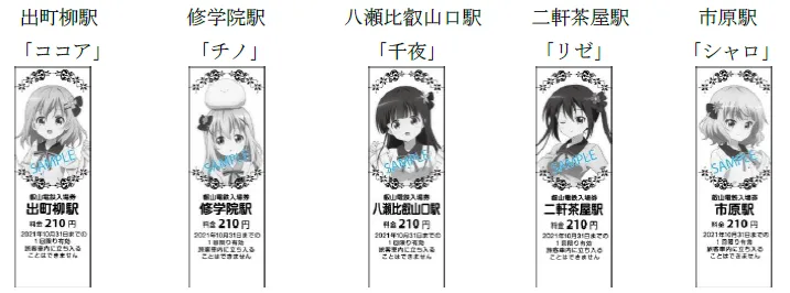 「ご注文はうさぎですか?」のキャラクター達のイラストが描かれた1日乗車券・硬券タイプの特別入場券・特典台紙・特典クリアファイルのセットを以下の通り発売します。