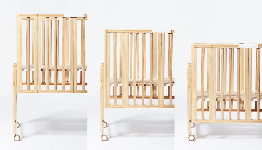 現代の限られた住環境に配慮し、子育ての空間を広くするために「しまいやすい家具」という発想でベビーベッドを作り上げました。