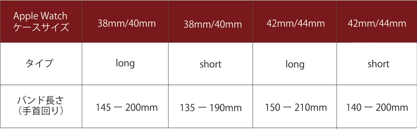 サイズ:38-40mmのショートサイズとロングサイズ、42-44mmのショートサイズとロングサイズ