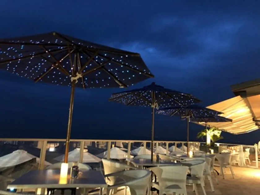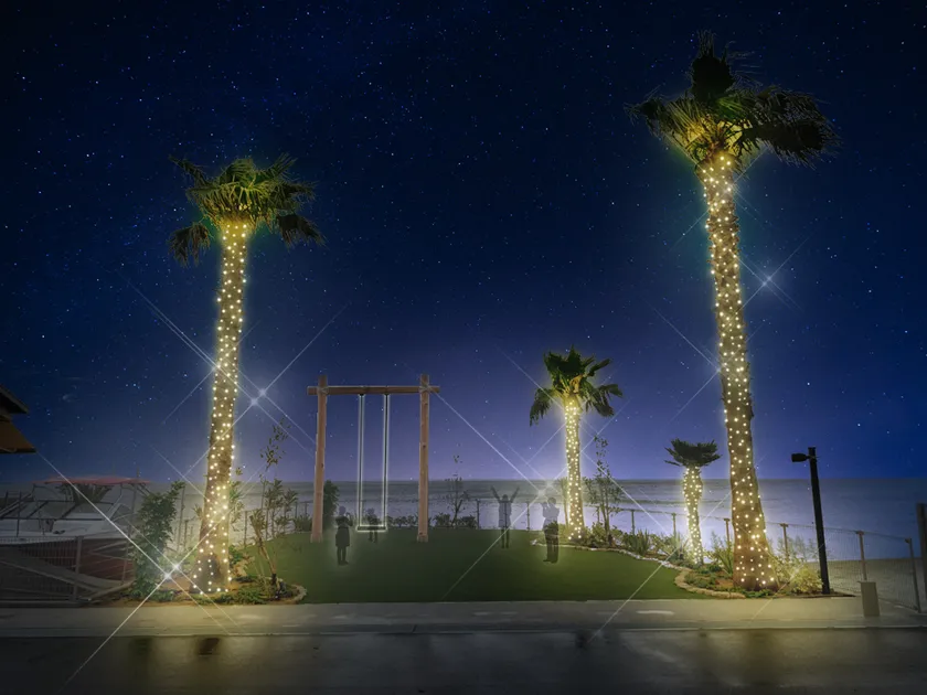 ヤシの木や広場を飾るアクアブルーやシャンパンゴールドの光が、海辺で過ごすひとときをロマンチックに演出。