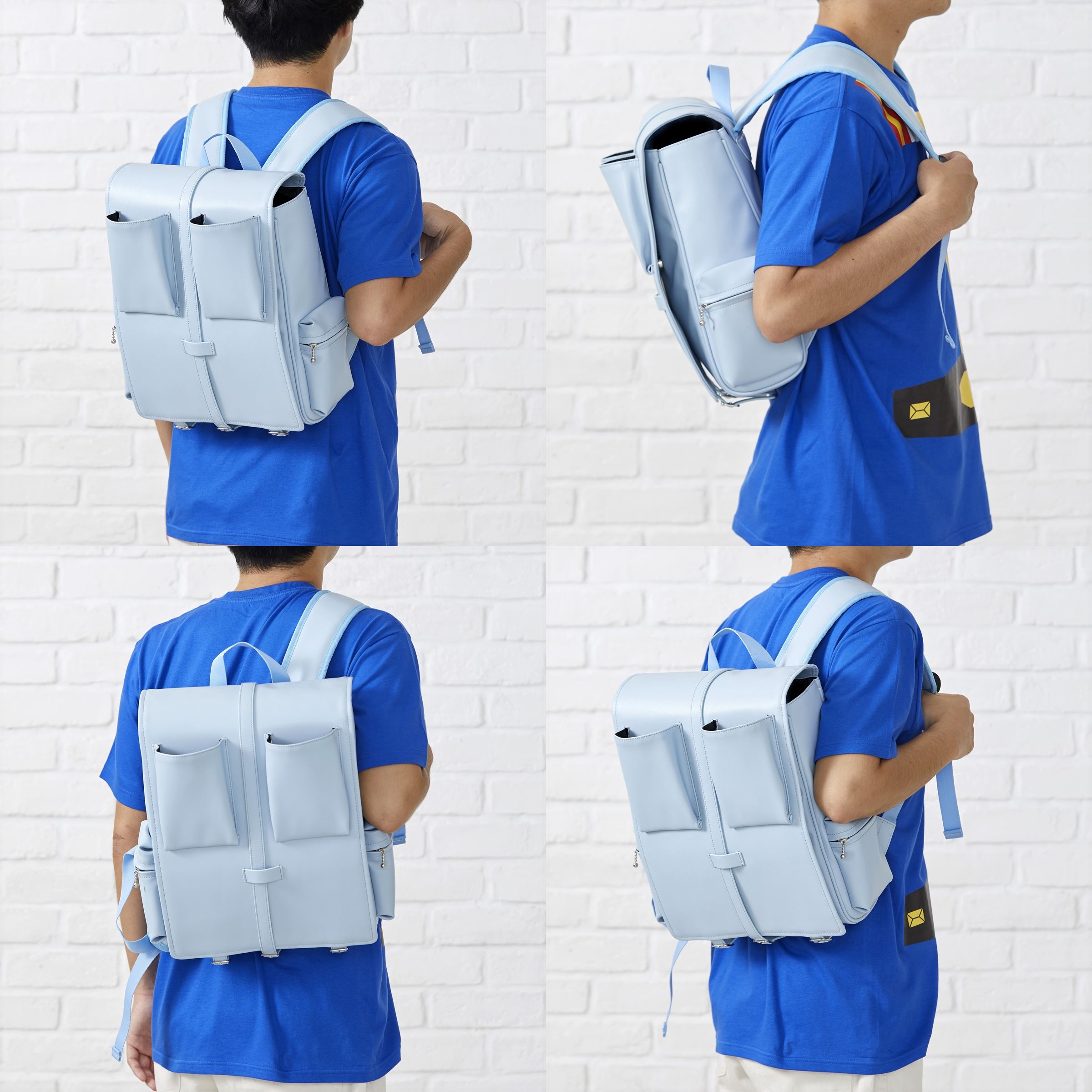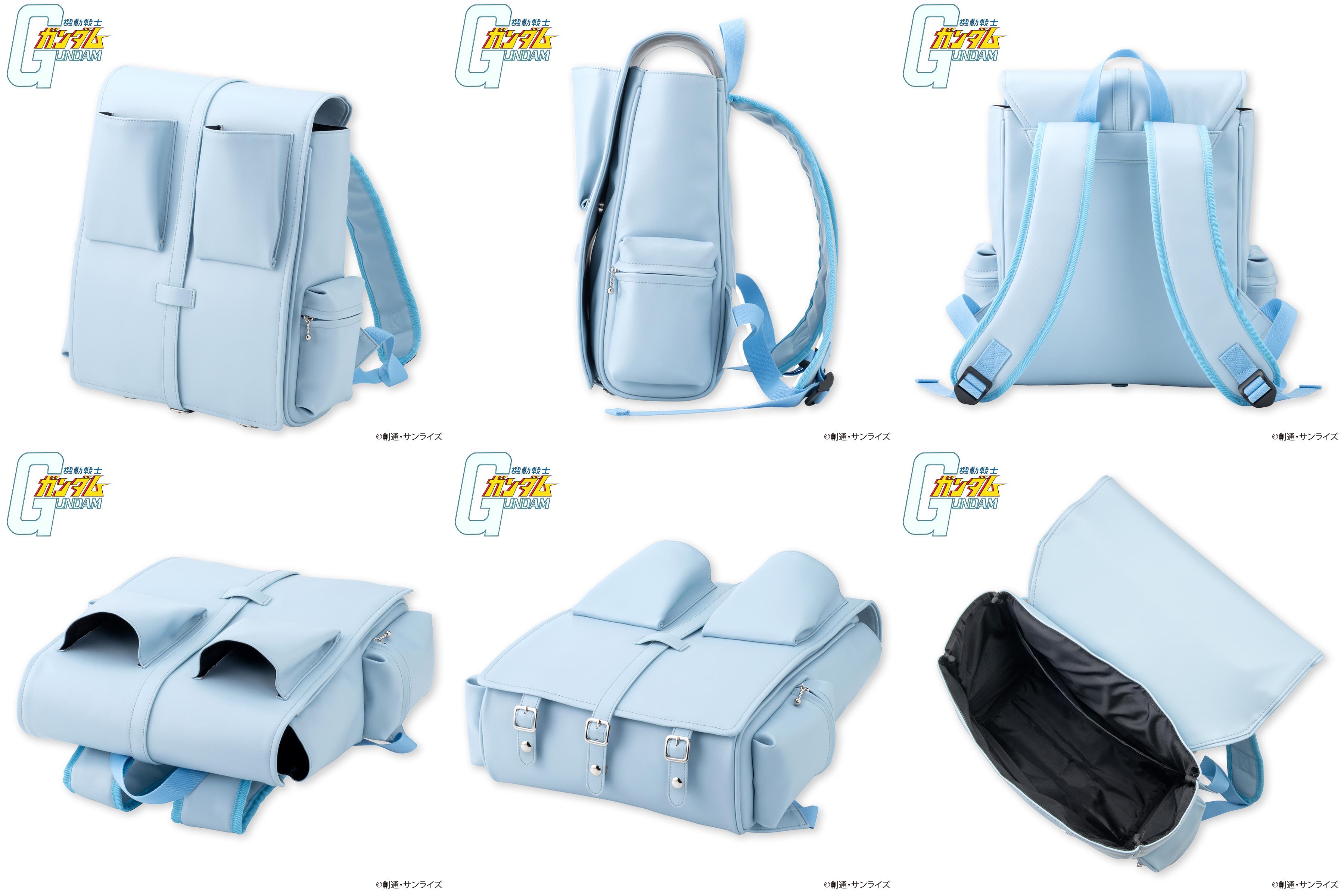 作中でアムロが使用するリュックをモチーフにした「アムロのリュックサック」は、独特な四角い形状やポケットの形状が再現できるように合成皮革を使用しております。サイドポケットは、ジップを付けて使い勝手も意識しました。大きすぎず、小さすぎずのサイズ感なので日常使いもしやすいリュックサックに仕上がっています。