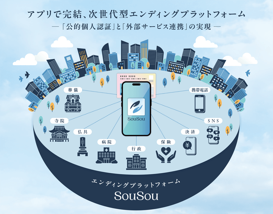 「SouSou」はマイナンバーカードを活用した新しいデジタル終活サービスです。エンディングノート等の終活に必要な様々な機能を、アプリ利用料完全無料・ワンストップで提供します。また従来のサービスにはない「①本人性/真正性の担保」・「②逝去判定のデジタル化」・「③外部サービス(データ)連携」という3つの特徴を備えており、今後は様々なパートナー企業との連携を通じて、ご逝去後の各種手続きの自動化・簡略化を目指します。