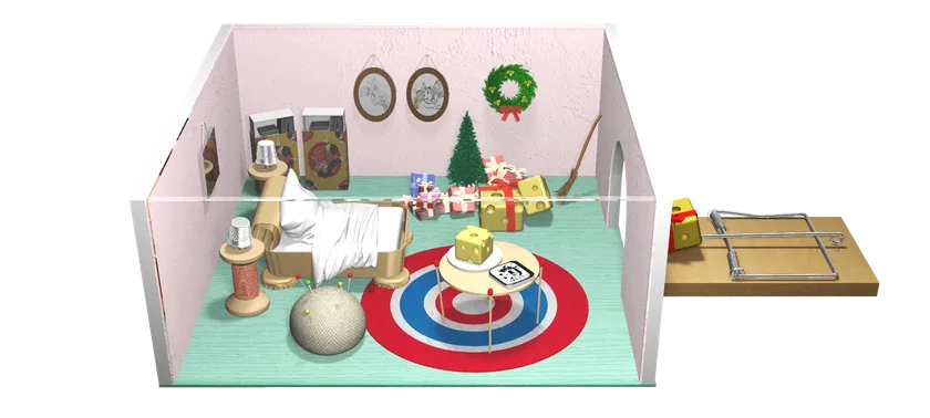 フォンテーヌ広場では、トムとジェリーがいつもの「おいかけっこ」をしているクリスマスの日の部屋を再現しています。トムがずっとジェリーを追いかけ回していたら、ジェリーがいなくなってしまいました。部屋中を探すトムと一緒にジェリーを探し、トムよりも早くジェリーを見つけてみてください。