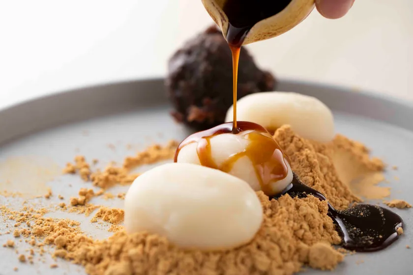 もっちもちの大粒も白玉にたっぷりのきなこをトッピング!くろみつと粒あんも忘れずに!