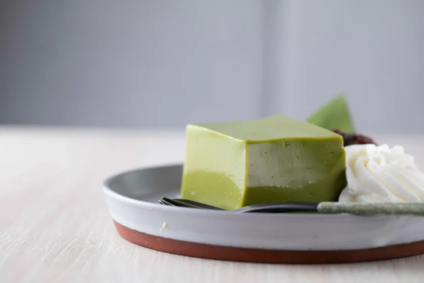 なんぶ茶くずねりを使用した、南部よろこび茶食堂オリジナルのパフェ。口あたりがとろんとなめらかなブランマンジェと、濃厚な抹茶のソース、北海道産の小豆を丁寧に炊き込んだ上品な甘みの粒あんに、白玉をトッピングして和風のパフェに仕上げました。