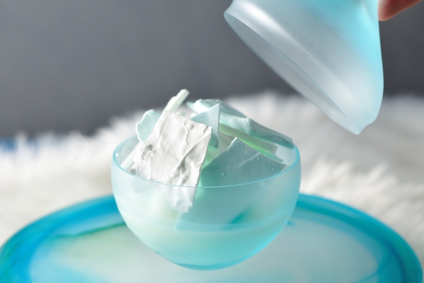 クリスマスに欠かせないデザートには、氷瀑をモチーフにした氷瀑スイーツを提供します。氷瀑の白と青を基調とした色合いで、甘酸っぱい味わいが特徴です。牛乳のブランマンジェ(*1)の上に、アールグレイのクリーム、苺のコンフィチュール(*2)をのせ、さらに青みがかったメレンゲやチュイルを散りばめました。サクサクとしたメレンゲと、口当たりがなめらかなクリームで表現した氷瀑と雪が口の中で共演し、食感の変化が楽しめる一品です。