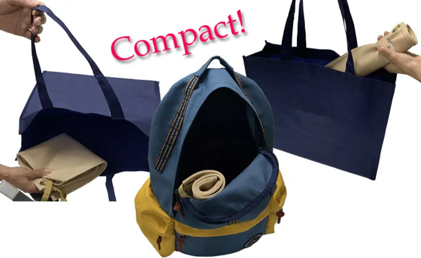 着脱が簡単な商品なので、自身で持ち歩いて訪問先の椅子への設置も可能。やわらかい素材のためコンパクトになり、折り畳みでもクルクル丸めてもバッグにすっぽり収まります。小さく折りたため持ち運べるので便利です。