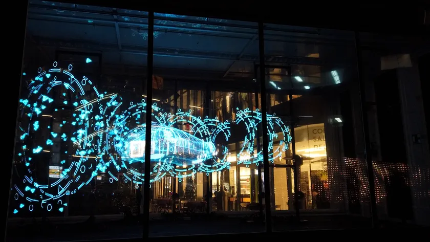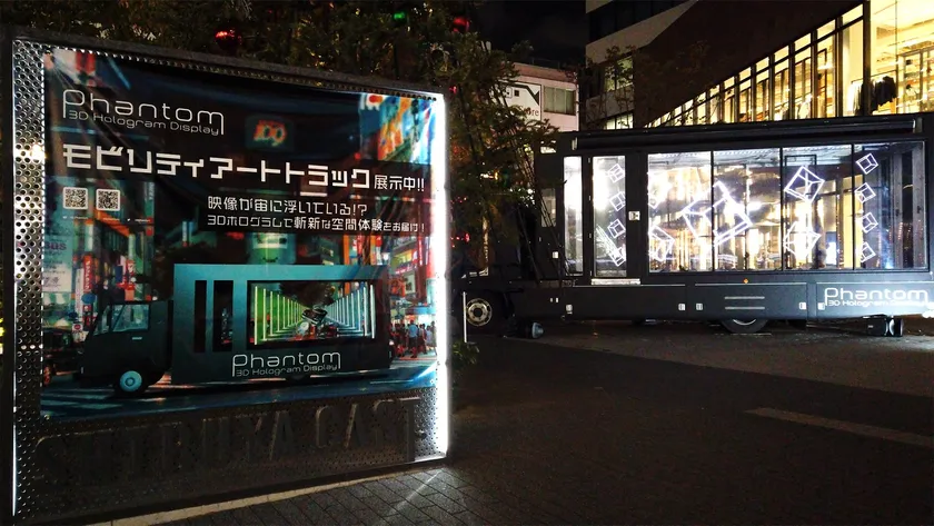 トラック自体がスケルトンのため、ガラス越しに木々や建物などの街並みが普通に見え、それらを背景としながら宙に映像が浮いているかのように見えます。