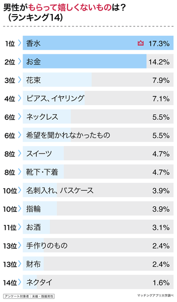 一方で「財布(2.4%)」や「ネクタイ(1.6%)」など、女性がプレゼントに考えている上位の物を嬉しくないと感じる男性は少ない結果です。