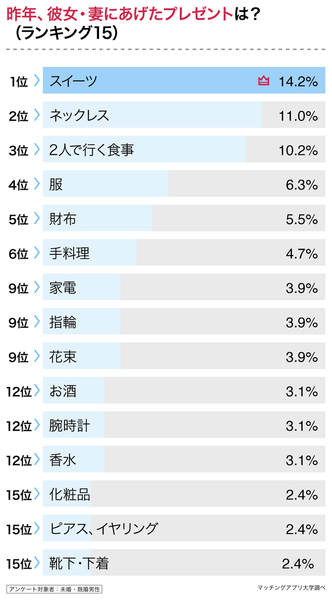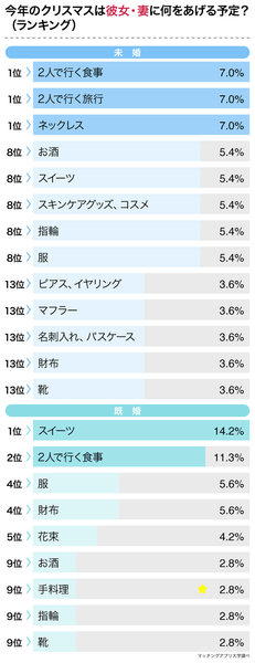 その結果、未婚者の1位は同率で「2人で行く旅行(7.0%)」「2人で行く食事(7.0%)」「ネックレス(7.0%)」、既婚者の1位は「スイーツ(14.2%)」でした。