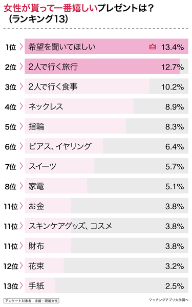 1位は「希望を聞いてほしい(13.4%)」でした。2位、3位は僅差で「2人で行く旅行(12.7%)」、「2人で行く食事(10.2%)」でした。そのあとは「ネックレス(8.9%)」「指輪(8.3%)」「ピアス、イヤリング(6.4%)」とアクセサリー類が続きました。
