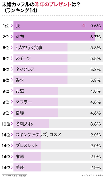 昨年の未婚カップルのクリスマスプレゼント1位は「服」