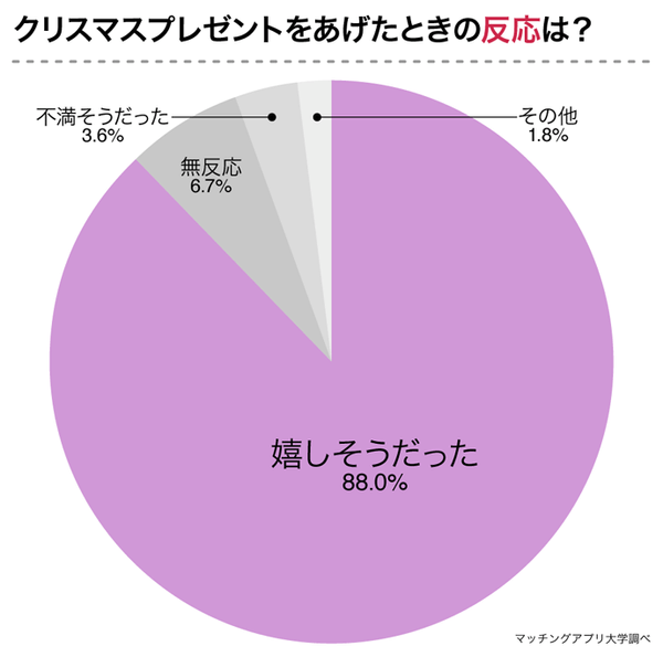 「無反応(6.7%)」や「不満そうだった(3.6%)」とネガティブな反応だったと回答したのは合計10.3%で、残りの約9割はクリスマスプレゼントで相手を喜ばせることに成功していることが分かりました。