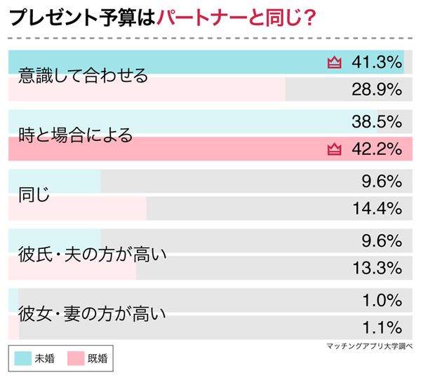 未婚・既婚の男女に「予算はパートナーと同じですか?」と聞いたところ、未婚は「意識して合わせる(41.3%)」、既婚は「時と場合による(42.2%)」がそれぞれ1位でした。