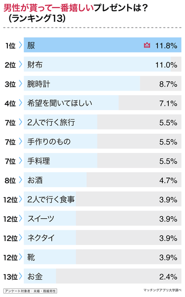 1位は「服(11.8%)」「財布(11.0%)」でした。女性の回答では1位だった「希望を聞いてほしい」は7.1%と、女性よりかなり少ない結果になりました。