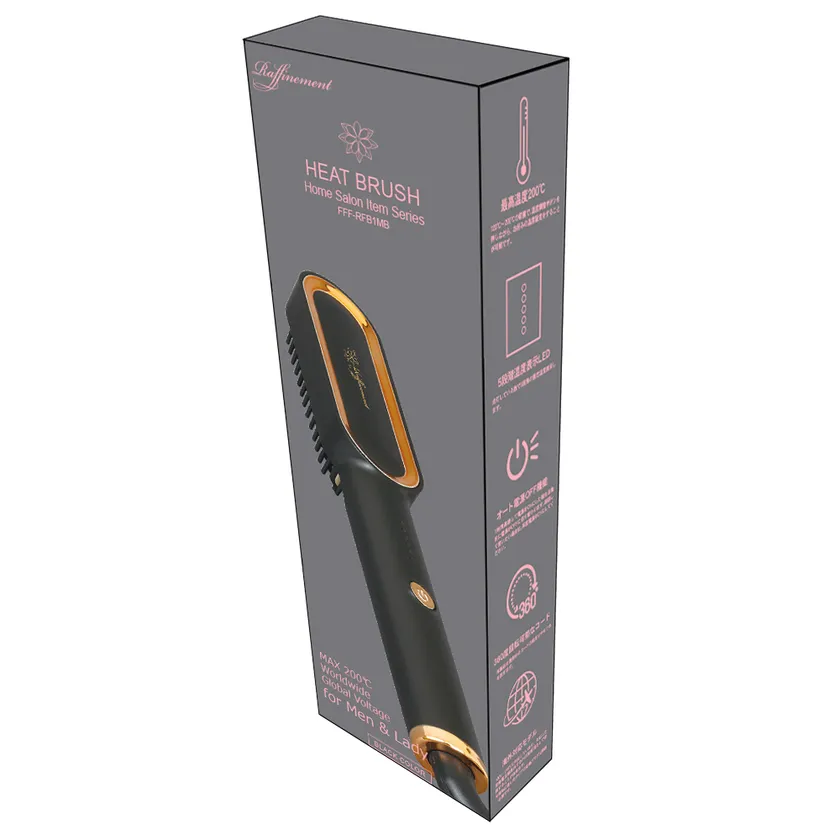 ヒートブラシは120℃から200℃までの5段階に温度設定ができ、ご自身の髪質に最適な温度を設定できます。ブラシ部分は柔らかいゴム素材でコーティングしており、本体の電源ケーブルは360°回転するのでコードが絡まりにくい設計となっております。長い髪のスタイリングはもちろん、男性でも寝ぐせや髭のお手入れにも最適なブラシです。カラーはブラックに高級感のあるゴールドのフレームをあしらったデザインとなっております。