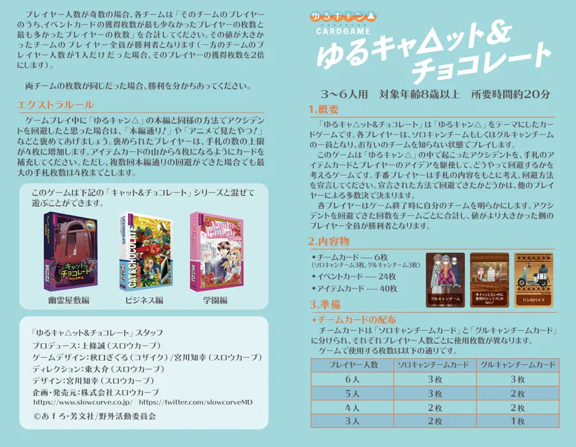株式会社スロウカーブ(所在地:東京都千代田区、代表取締役:上條 誠)は、人気アニメ「ゆるキャン△」のカードゲーム第4弾として、日本ボードゲーム大賞を受賞した名作カードゲーム「キャット&チョコレート」の「ゆるキャン△」版、『ゆるキャ△ット&チョコレート』を11月16日(月)よりAmazon、全国のカードゲームSHOP他にて発売いたします。