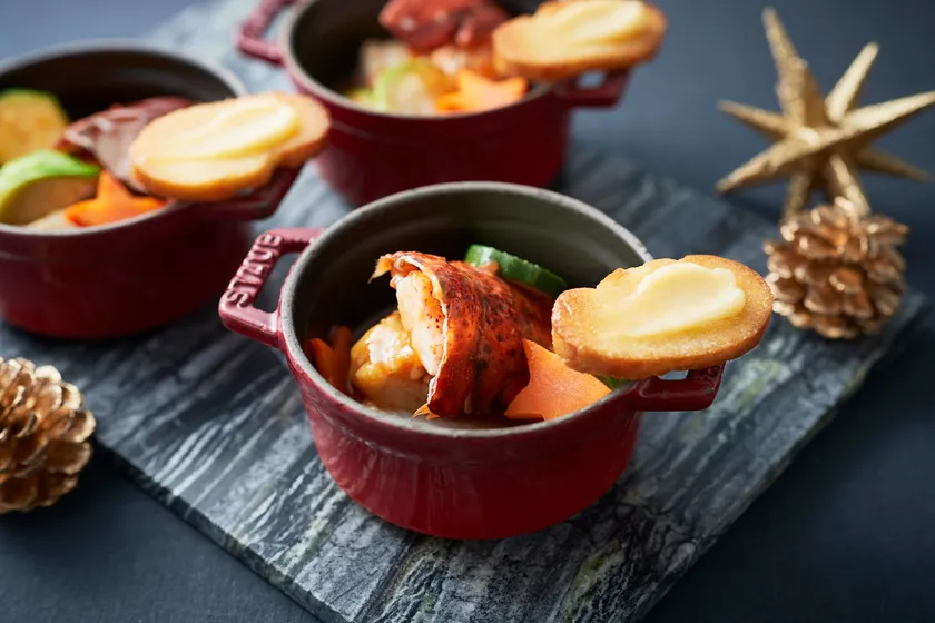 魚介の旨味が凝縮したスープに丁寧に火入れしたオマール海老。可愛らしいココットに盛り付けご提供。