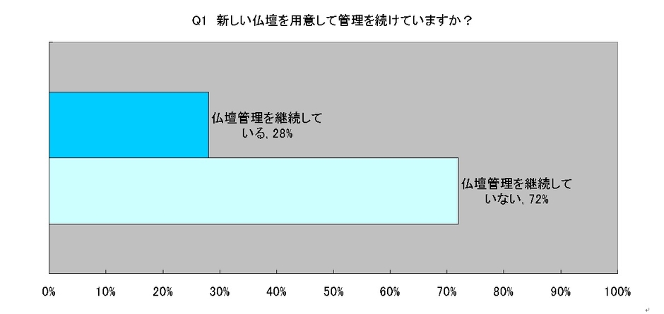仏壇を処分した後に、新しい仏壇を用意して管理を続けているか尋ねてみたところ、「仏壇の管理を継続している」(28%)、「仏壇の管理を継続していない」(72%)という結果となりました。