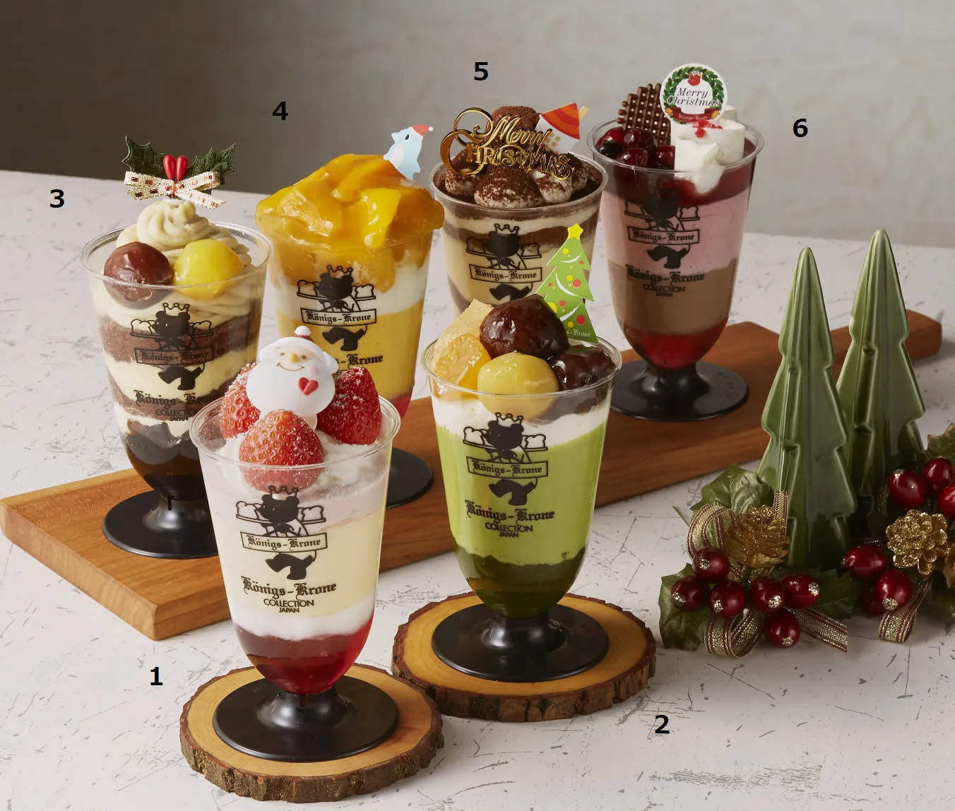 レアチーズケーキやティラミスなどバラエティー豊富な人気のパフェ6種類がセットに。