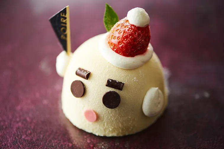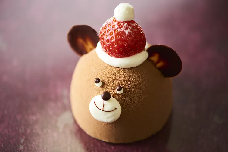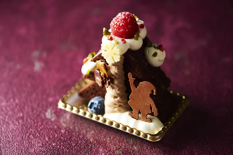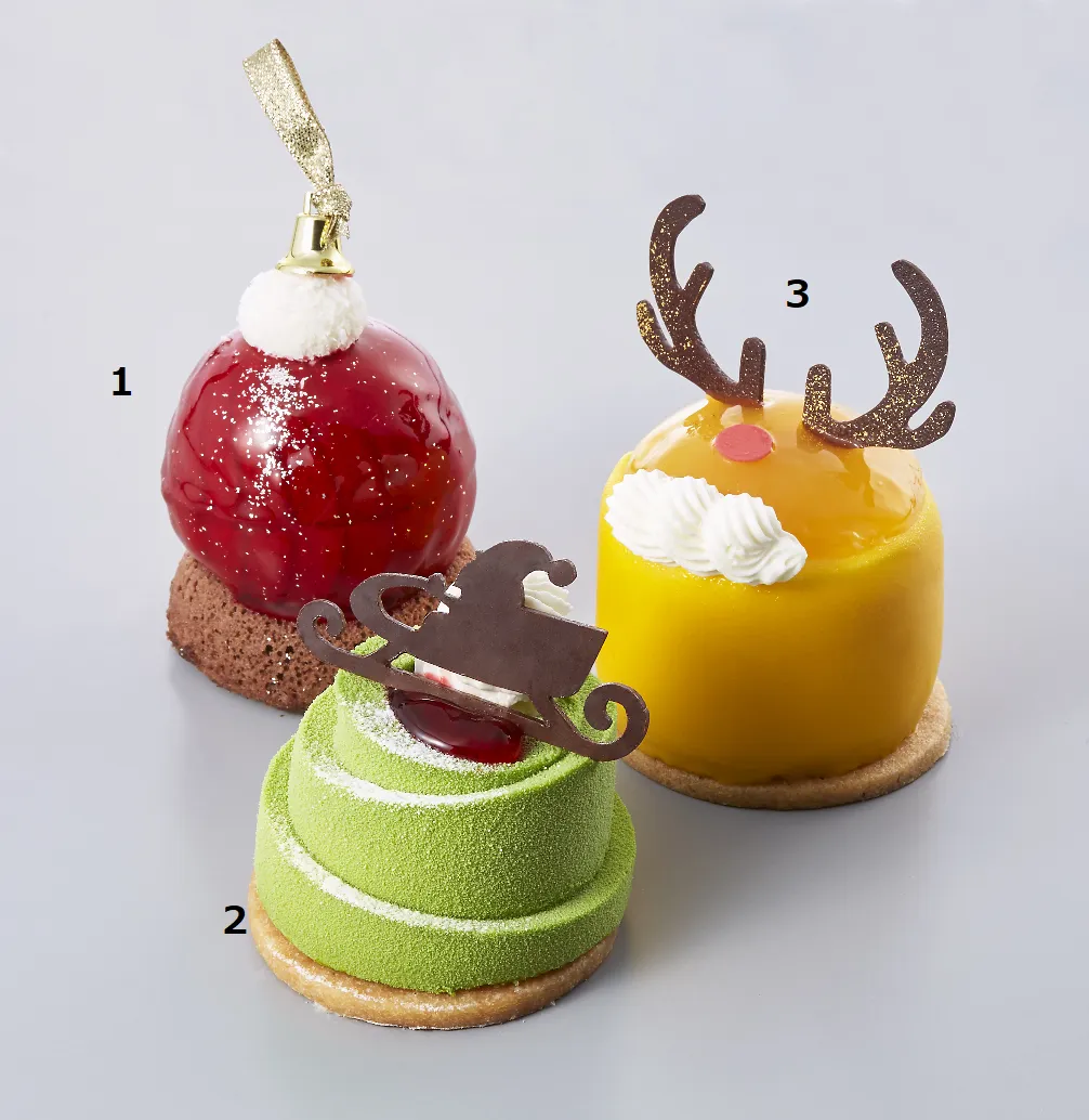 苺とチョコレートのムースでサンタを、ピスタチオムースでクリスマスツリーを、オレンジ風味のレアチーズムースでトナカイを表現したケーキが登場。