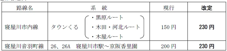 寝屋川市内線及び寝屋川音羽町線の運賃改定について