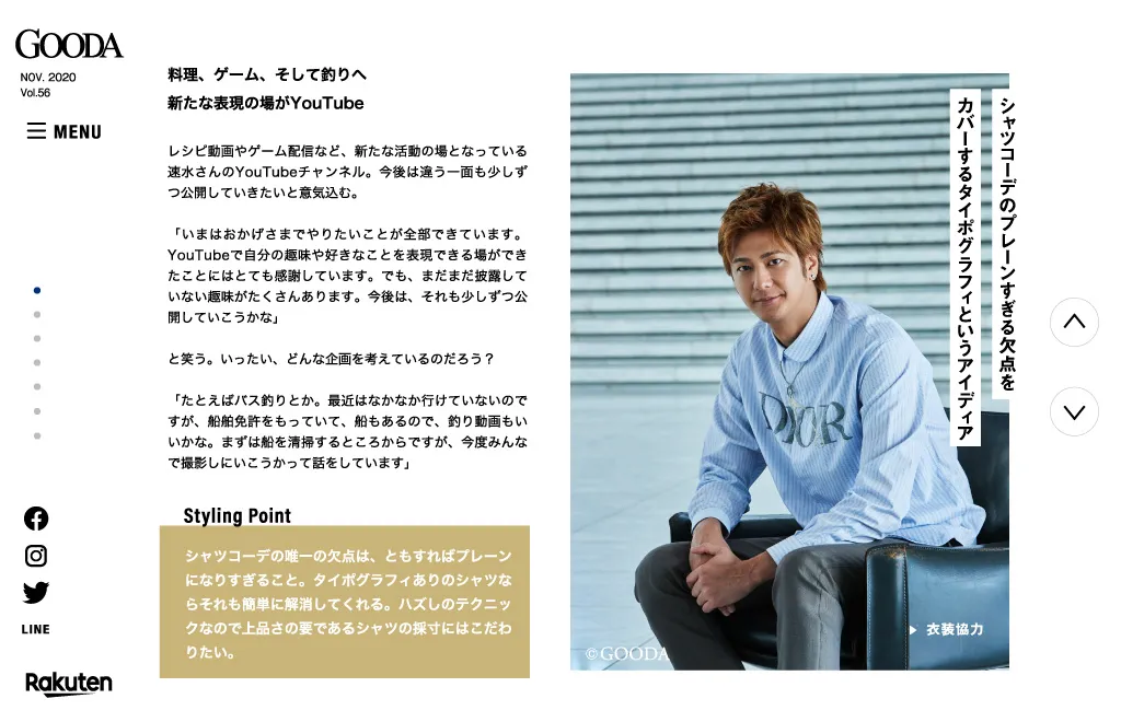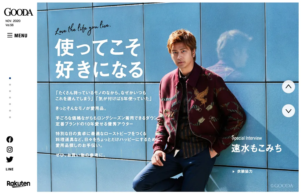 手にするだけで毎日ちょっとハッピーな気持ちになれる。そんなとっておきを紹介しているライフスタイルWEBマガジン「GOODA(グーダ)」。表紙には俳優業のかたわら、朝の情報番組で料理コーナーを担当し、およそ8年間に渡って数多くのレシピを考案してきた速水もこみちさんが登場。愛用品をテーマにしたインタビューでは、70〜80本の包丁をもっていること、世界の味を求めて旅をするときに役立つワールドタイム機能が付いた腕時計のことなどを話してくれました。ほかにも、一週間分のコーディネートを前もって準備するという几帳面な一面や、スニーカーにイラストを描き世界にひとつのマイシューズにしていることなどについても語ってくれました。ほかにも5万円以下で手に入る良質ダウンジャケットをセレクトした特集、10年愛せる優秀なアウターを紹介する企画、秋から冬にかけてキモパンと呼ばれるカワハギ釣りに挑戦した釣り連載、料理道具コンサルタント・荒井康成さんが監修するローストビーフ器具特集、国民の愛人といわれる橋本マナミさんに男性からもらった思い出深いプレゼントについて聞いたインタビューなど、今号も充実の内容でお届けします。