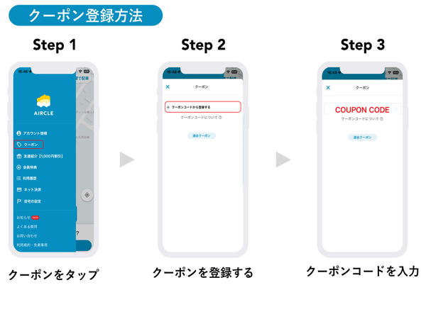 JAF会員サイトよりダウンロードした当社アプリ内で、クーポンコードを入力頂くことで割引クーポンが適用される流れとなっており、初めて使うお客様に利用しやすい価格設定でご提供しています。