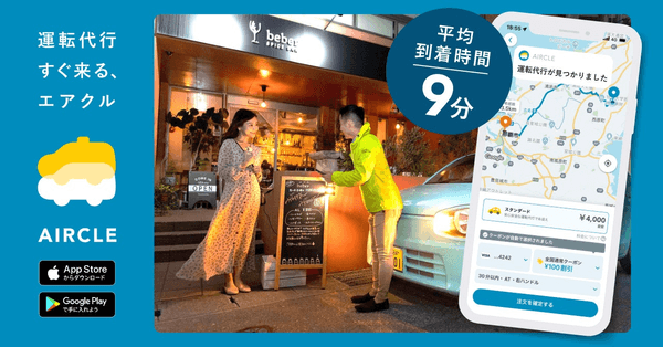 運転代行配車アプリ「AIRCLE(エアクル)」は、利用者と運転代行業者を繋ぐ配車サービスです。現在は沖縄県と福岡県に展開し、国内最大級の配車アプリとしてシェアを広げています。